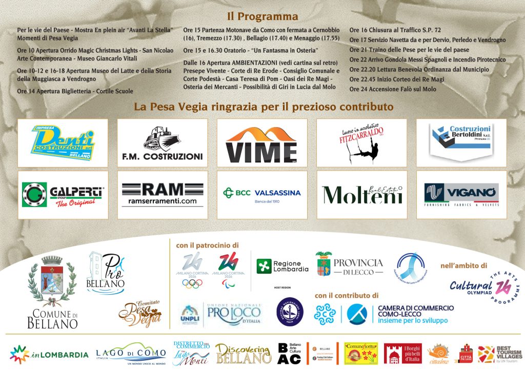 La Pesa Vegia 2026 – 420° anno, appuntamento immancabile delle festività natalizie, si terrà come di consueto il 5 gennaio e rappresenta un traguardo di eccezionale valore storico, simbolico e identitario per il Comune di Bellano e per l’intero territorio del Lago di Como.